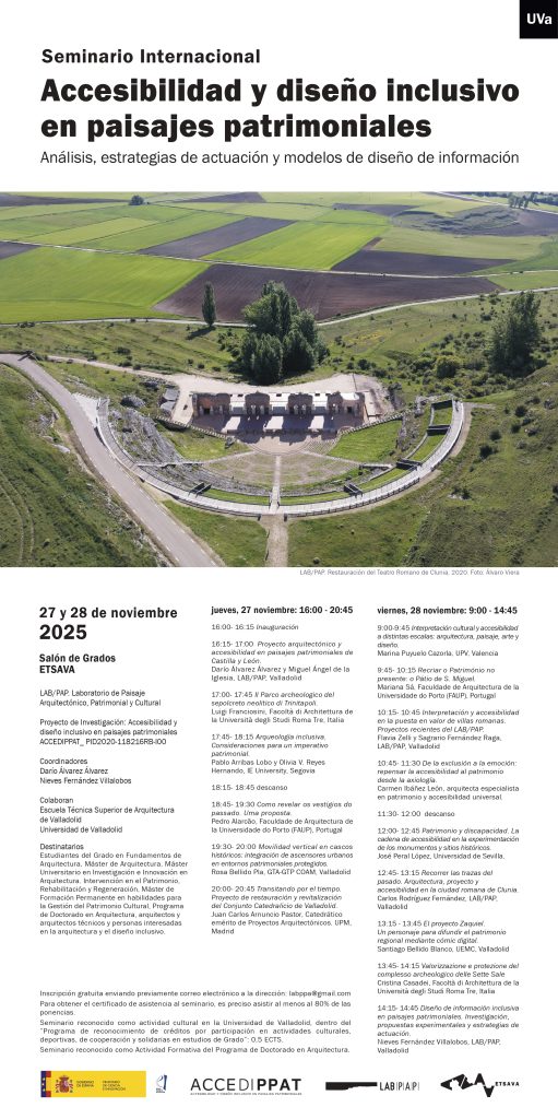 El jueves 27 de noviembre por la tarde y viernes 28 por la mañana se celebrará el Seminario “Accesibilidad y diseño inclusivo en paisajes patrimoniales: análisis, estrategias de actuación y modelos de diseño de información”, organizado por el proyecto de investigación homónimo y desde el grupo de investigación LAB/PAP.